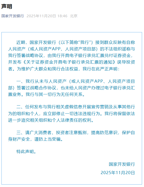 新京报11月20日,国家开发银行发布声明称:近日,国家开发银行(以下简称“银行”)因公众举报,有传言称某自称“人民资产”(或“人民资产APP”、“人民资产项目办”)的不法组织与本行签订战略协议,本行将发行用于赎回股票资金的电子银行汇票,国家开发银行(以下简称“本行”)发布《关于电子化发行证券的通知》。 “股票基金银行收据”欺骗投资者。为保护社会公众和本行的合法权益,本行郑重声明如下: 1、本行从未与人民资产(或人民资产APP、人民资产项目部)签订任何战略合作协议,从未办理过人民资产电子银行承兑业务。难道你们的行为与我们无关吗? 2。任何组织和个人出于广告、营销目的发布有关本行的虚假信息或者从事其他活动的,必须立即停止一切非法活动。本行保留依法追究关联组织和个人法律责任的权利。三、消费者和投资者应密切关注把控,增强防范意识,保护资产安全,谨防上当受骗。编辑 申真