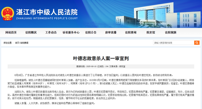 北京新闻于8月18日在张江省的中级受欢迎法院的网站上说,张古纳省省法院,中级受欢迎的法院,被告人故意谋杀了被告Ye Dezhi,根据法律,根据法律判处他的一生,并判处他的生命,并命令他的生活和一生。审判后,发现被告Ye Dezhi的想法是杀死他的想法,因为他怀疑自己受到了Ye和其他村庄的伤害。 2025年3月27日晚上,Ye Dezhi带着两把包裹刀率领摩托车,失败了。他在Ye家门口减少了三名受害者:受害者Wei(死于69岁),Ye Muhua(死于36岁)和Muhua(死于1和11个月),导致三名受害者死亡。逃离现场后,Ye Dezhi试图自杀,并在家里被警察逮捕。识别出来,Ye Dezhi患有精神分裂症,在这种情况下,他的respon危能力有限。法院辩称,被告Ye Dezhi故意和非法地夺走了他的生命,他的举动构成了故意谋杀。你们的犯罪是严重的,残酷的措施,犯罪的后果尤其严重。犯罪的事实很明确,证据就足够了。必须根据法律对他们进行惩罚。 Ye Deji犯罪时犯罪责任有限,但清楚地理解了他在犯罪和犯罪后果期间的行为违法行为。犯罪手段特别残酷,犯罪的情况非常严重,犯罪的后果尤其严重。因此,没有给予轻微的惩罚。先前的审判将根据法律根据犯罪行为,性质,情况和被告社会的损害程度进行。家庭成员dand受害者,NPC特工,CPPCC的成员,E媒体记者和一生中的人参加了审判和著名的判决。根据以前的媒体报道,2025年3月27日在广东省利亚汉省的东部发生了刑事案件。 Aldeano Ye Moji在晚上偷偷溜进了邻居的家,残酷地杀死了他的祖父母和孙子。事件发生后,犯罪嫌疑人Muuji被确定为精神分裂症,并被评估为有限的刑事责任。这种情况正在在线关注。 XIN JING编辑
